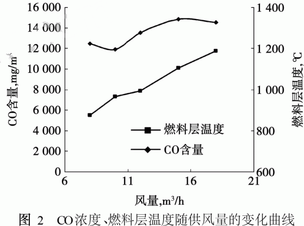 測(cè)量?jī)x器為:KM9106綜合煙氣分析儀;RY20型積分式熱量表;LZB-25型轉(zhuǎn)子流量計(jì);電子秤;熱電偶和HR1300/3750型便攜式混合記錄儀等。 實(shí)驗(yàn)用的生物質(zhì)顆粒燃料是用玉米秸稈壓縮成型的顆粒,顆粒為圓柱形,直徑8mm,長(zhǎng)度20~30mm。玉米秸稈的低位發(fā)熱量16284kJ/kg;水分含量5.08%;揮發(fā)份含量85.42%;灰分含量7.22%;固定碳含量2.28%;灰錐的軟化溫度(ST)<1000℃;熱重分析結(jié)果表明:玉米秸稈顆粒的揮發(fā)份析出溫度集中在220~270℃區(qū)間,峰值大約在235℃左右;焦炭燃燒的溫度區(qū)域是280~430℃。 2實(shí)驗(yàn)方法與實(shí)驗(yàn)內(nèi)容 根據(jù)GB 15317-1994工業(yè)鍋爐節(jié)能檢測(cè)方法;GB 10180-2003工業(yè)鍋爐熱工性能試驗(yàn)規(guī)程;GB 13271-2001鍋爐大氣污染物排放標(biāo)準(zhǔn);及GB 5468-1991鍋爐煙塵測(cè)試方法,在4種工況下對(duì)比試驗(yàn)、分析,對(duì)生物質(zhì)顆粒燃料燃燒運(yùn)行參數(shù)進(jìn)行試驗(yàn)確定[9-12]。 實(shí)驗(yàn)內(nèi)容: (1)采用一次供風(fēng)方式,改變送入的空氣量,篩選最佳過量空氣系數(shù); (2)采用最佳過量空氣系數(shù),將供給的風(fēng)量分為兩路供風(fēng)的方式,篩選最佳的一、二次供風(fēng)配比; (3)采用優(yōu)化的過量空氣系數(shù)和一、二次供風(fēng)配比,篩選最佳的二次送風(fēng)位置。二次送風(fēng)成噴霧狀。 (4)在最佳的供風(fēng)工況下,篩選最佳的燃料層厚度。 3實(shí)驗(yàn)結(jié)果與分析 (1)不同供風(fēng)量對(duì)排煙中CO濃度和燃料層溫度的影響
